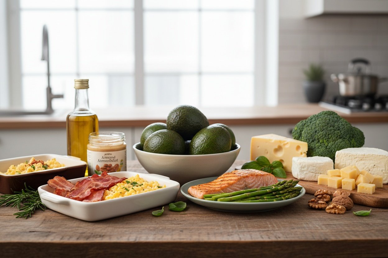 Typische keto voedsel omvat: vlees, vis, eieren, zuivel, noten, zaden, avocado's, olie, en groenten laag in koolhydraten (bladsalade, broccoli, courgette). Voedsel om te vermijden: brood, granen, fruit (behalve wat bessen), suiker, pasta, rijst, en de meeste verwerkte voeding.